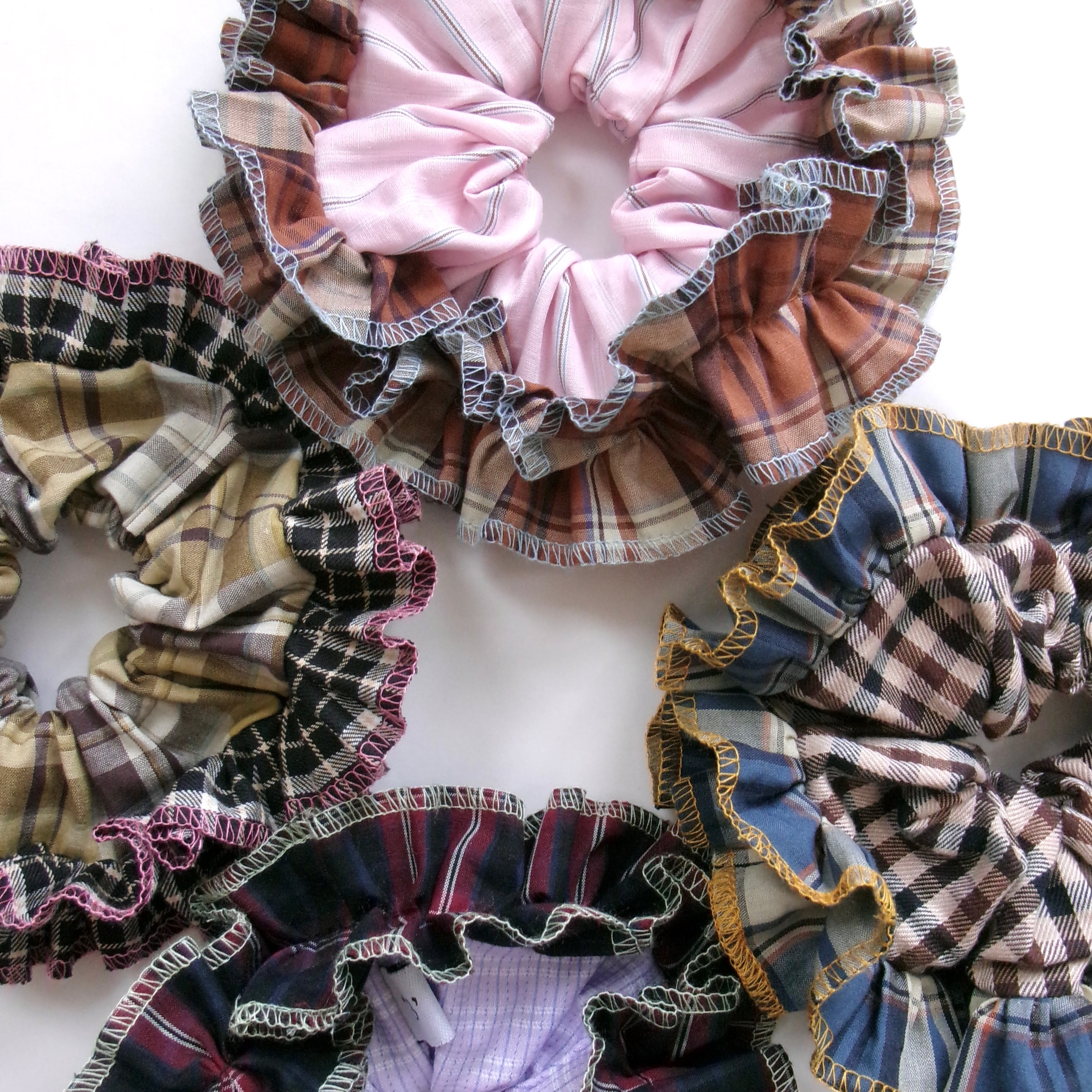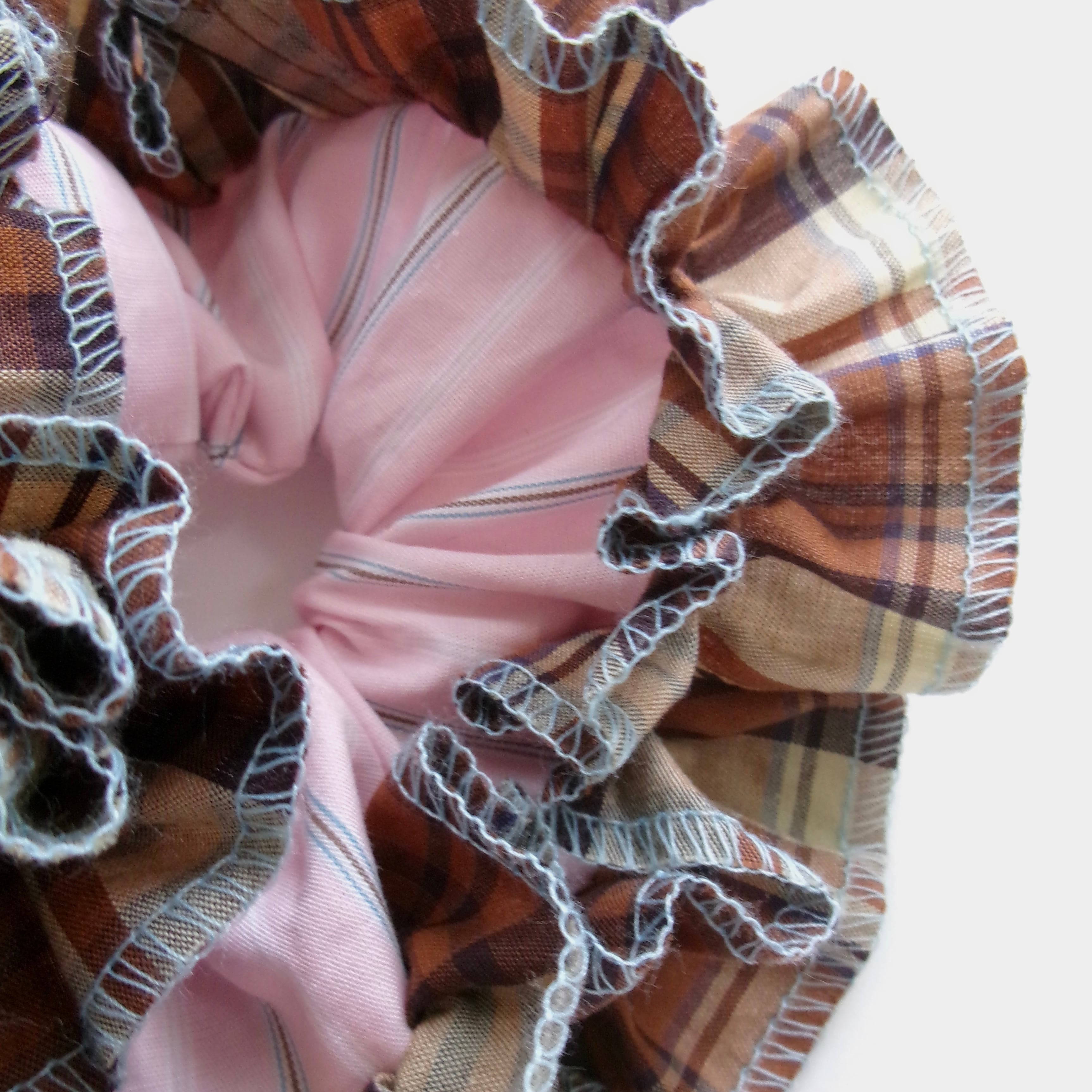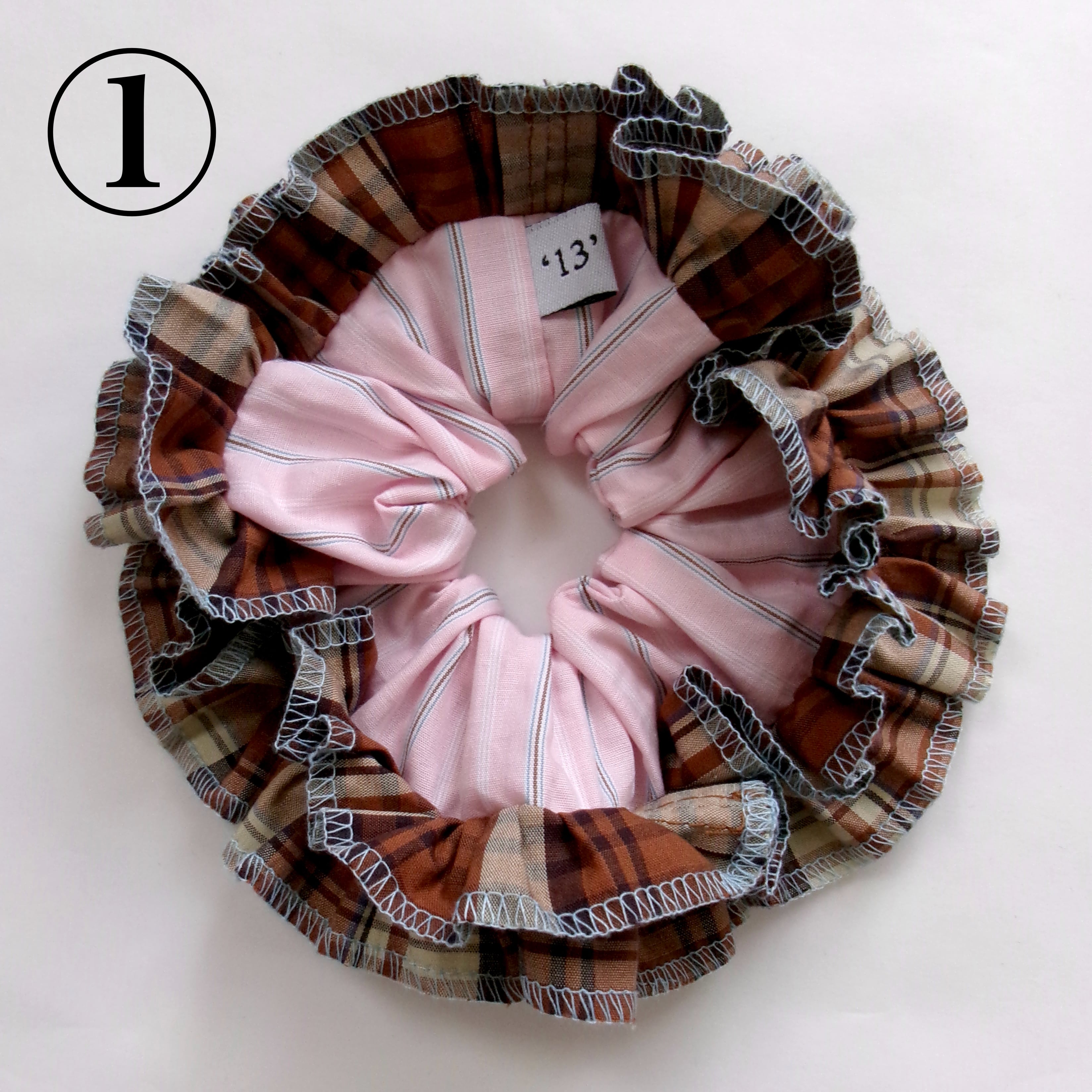 ①ブラウンカラーのチェック柄フリル(水色の糸)×ピンクのストライプ柄