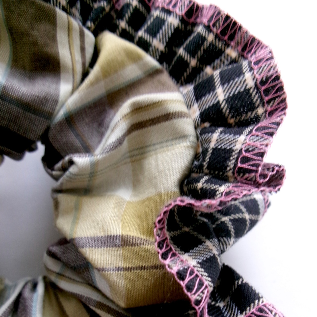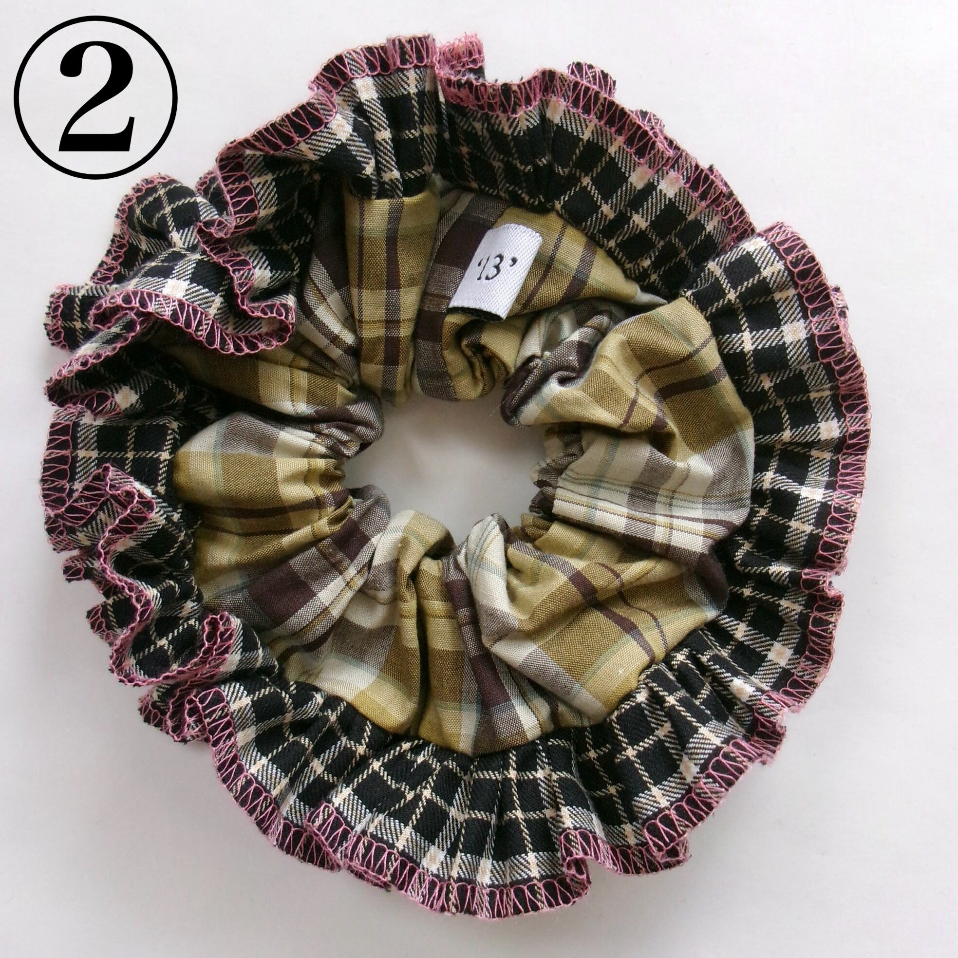 ②ブラックカラーのチェック柄フリル(ピンクの糸)×落ち着いたグリーン系のチェック柄